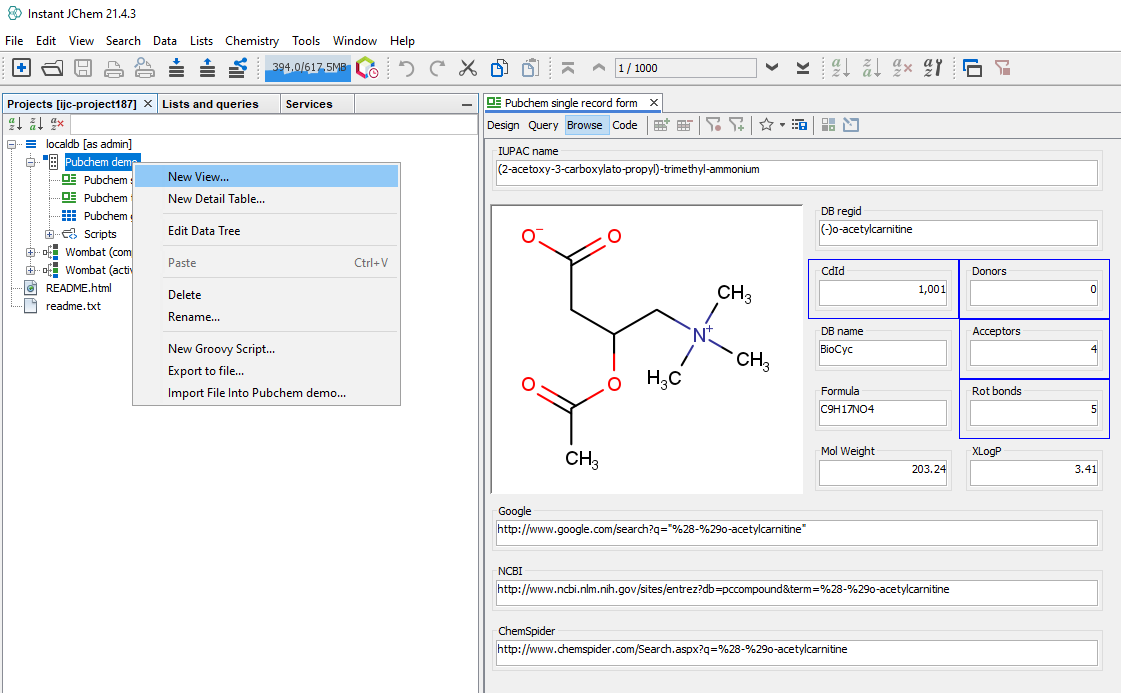 First, the fields to be shown in the Grid View from Selection need to be chosen. Open one or more form views which contain the fields desired to display in the Grid View from Selection and select the fields by clicking the corresponding widgets (at least two or more fields need to be selected). Thereafter, right-click on the Data Tree node (