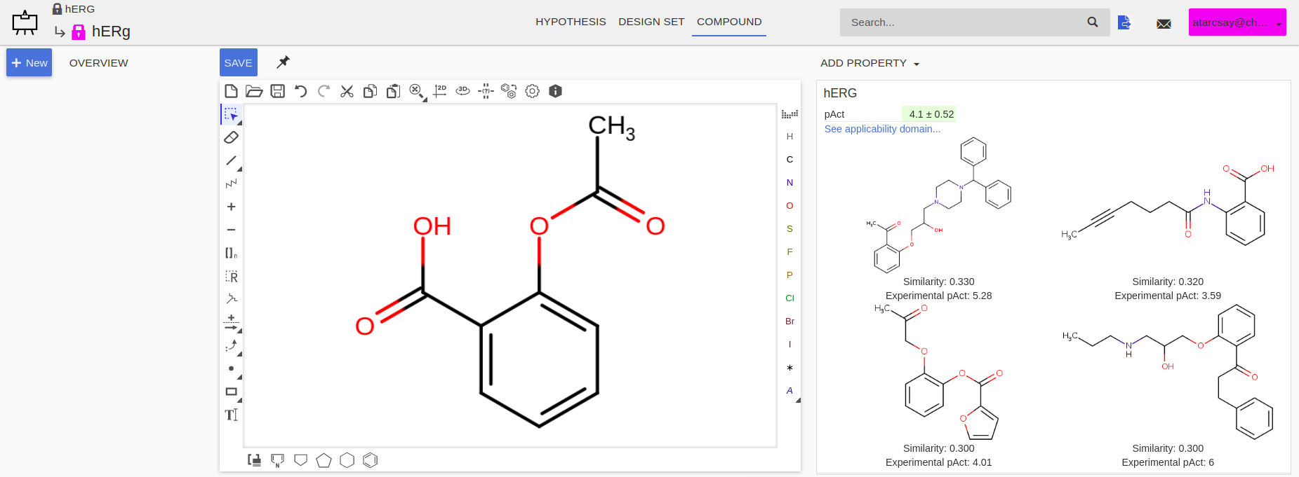 In Design Hub predicting hERG activity can be done with the Add Property » hERG menu item. The predicted activity value with its applicability domain appears next to the drawing canvas.