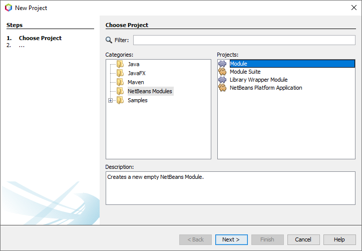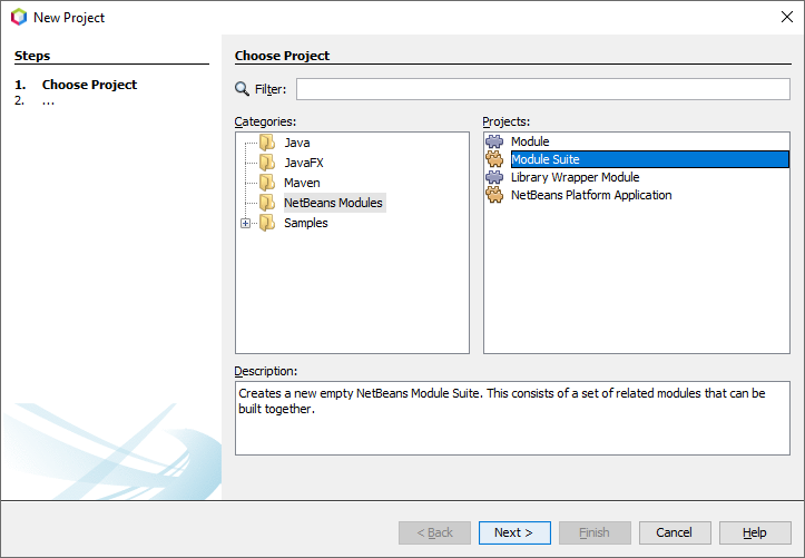 The first step is to create NetBeans module suite. Open NetBeans IDE, use new project wizard from the main menu Files -> New Project...