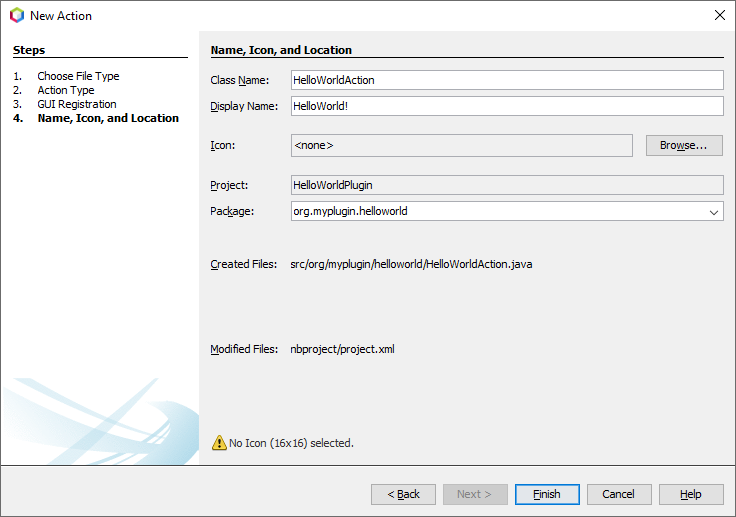 After clicking next the last page is shown, which allows entering the action's java class name, display name, icon, etc. In order to keep things simple we will just enter the class name and display name and leave the other options as they are. Let's call our action's class HelloWorldAction and set its display name to Hello World!. The display name is a string that will be displayed in Instant JChem's menu when we run our plugin.