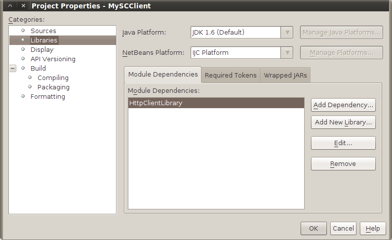 1. You should still have the 'Project Properties' dialog open from adding HttpClientLibrary module dependency. Click 'Add Dependency...' button again and specify additional modules that 'MySCClient' module will use.