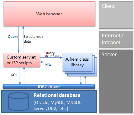 Another solution is a two-tier architecture, where the client Java or .NET application uses JChem Base and JDBC API to interact with the database. In this case, chemical structure input and output may use Marvin Sketch and View beans components embedded into the client application.