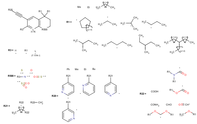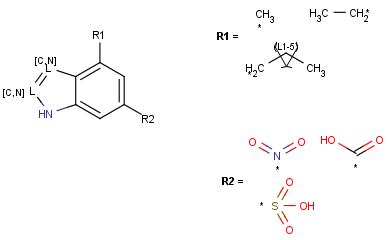 - Any structures : All types of structures are allowed. Supported search types: substructure, full structure, full fragment, duplicate, superstructure, and similarity search. However, no structure type specific searching takes place in every cases (e. g. similarity values for reactions will not distinguish reactants, products and agents; only the scaffold fragment of an R-group structure target is taken into account in substructure search). For example, the following structures may be stored in "Any structure" type tables: