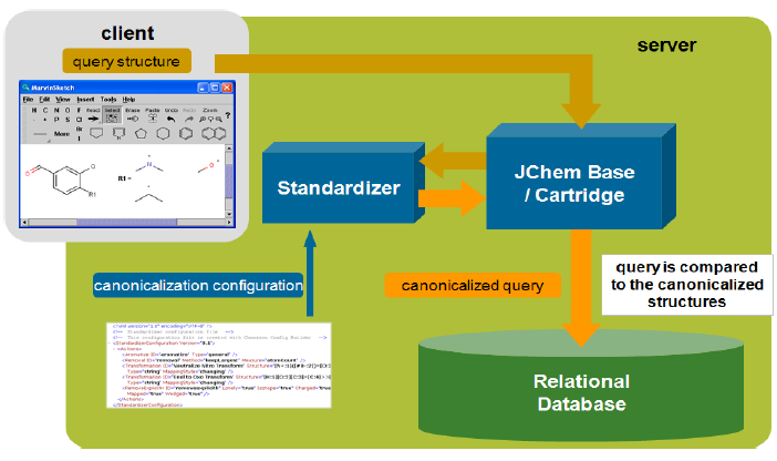 The database molecules are standardized during structure import into a JChem table (and also during structure update). First the original source of the chemical structure is stored in the cd_structure field, which can then be used for displaying and export purposes. The standardized form is then stored in the cd_smiles field in a compact format. This representation is used by the search process. All additional structure-dependent data (fingerprints, molecular weight and formula, Chemical Terms calculated columns) are also calculated from the standardized form. In case of JChem index in the Cartridge, this process is done during index creation (and during structure insert/update in an indexed structure column), and the standardized form is stored within the index.