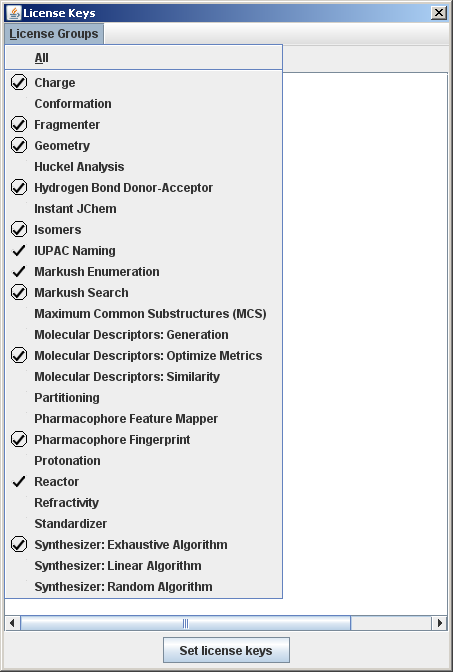 Note: License handler tool is available in Marvin 4.1/JChem 3.2 and above. In preceding versions license keys have to be set by editing the licenses.dat file, as described below.