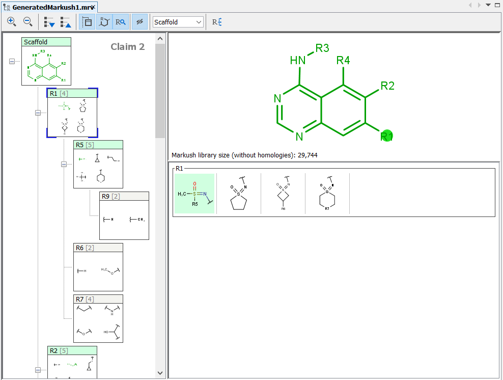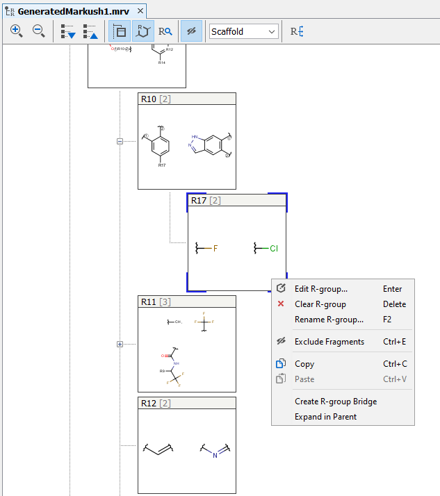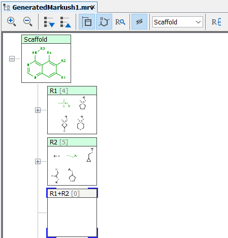 The Markush structures of the opened file are organized and arranged in the Editor panel. In the tree view, the scaffold is presented on the first (parent) level of the tree, and the associated R-groups are classified as its children. The scaffold(s) and attached groups are denoted by named boxes. The parent level boxe is named as "Scaffold". Nested nodes are labeled according to the represented R-group definitions (e.g.: R1, R2,...Rn or the alias of the R-group if it has one), followed by the number of members. To view any scaffold or R-group definition, select the relevant node. The structure(s) of the chosen element will be presented in the fragment view. The selected items are highlighted in the tree view.