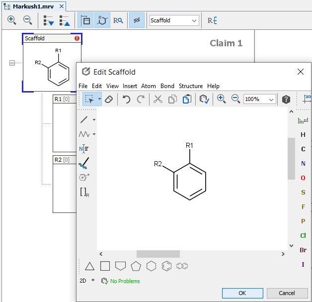 This section contains a description of features specific to creating Markush structures and organizing them into claims. To learn more about editing Markush features visit Marvin Sketch (the built-in chemical editor of Markush Editor) documentation.