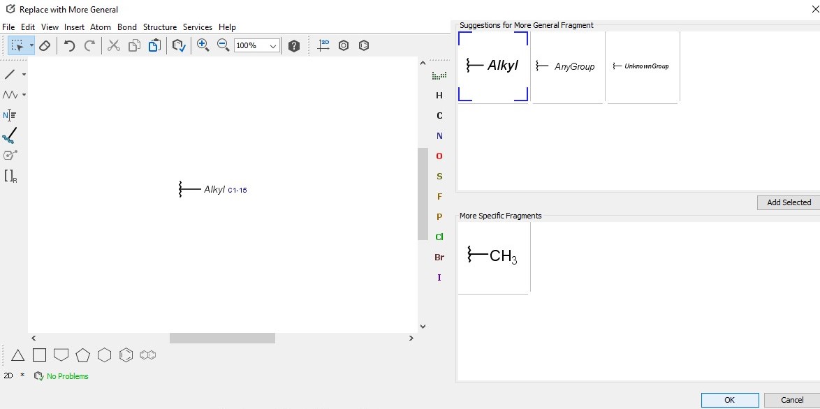 In the dependent claims, you can replace selected fragments with a more specific or more general definition to change the scope of the claim. Select a fragment of a claim which has a dependent claim right-click on it, push Replace with more General.... Then define the group or accept one of the suggested generalized fragments. For a dependent claim a fragment definition can be narrowed by right-clicking on it and selecting Replace with more Specific...