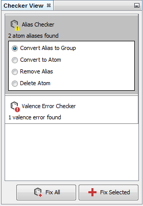 Structure checker panel displays the structure drawing errors and warnings related to the active editor component. In the case of an error, an exclamation mark appears in a red circle. In the case of a warning, a yellow triangle appears. By clicking on the checker items, you can choose between the available automatic fixer options. You can fix the issues one-by-one with the Fix Selected button or all together with the Fix All button.