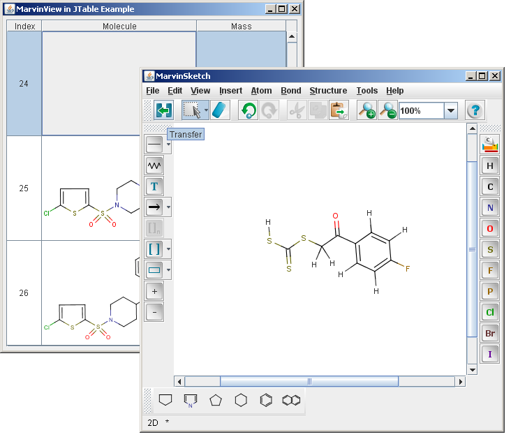 In typical Java applications, the javax.swing.JTable is used to display tables of data. This form of visualization form will be referred to as tables. This section demonstrates how can molecules be rendered with Marvin inside existing tables.