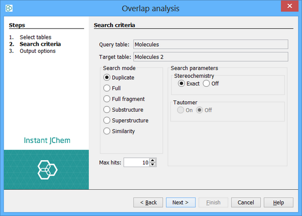 Instant JChem provides a simple way to look for identical or similar structures in two database tables. This allows you to answer questions like: