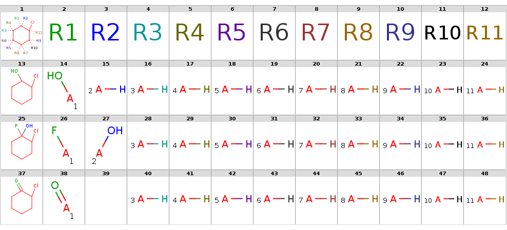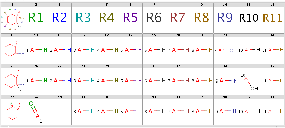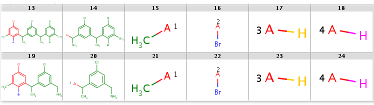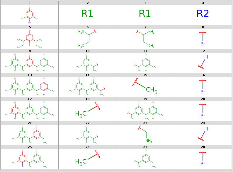 The following examples show some decomposition tables that can be obtained by running the rgdecomp command line tool or directly using the R-group Decomposition API. Atom color codes are set in atom sets if the output format is MRV, or defined in Colors.ini