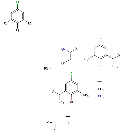 Note, that the second target is not covered by this Markush structure, since it does not have a decomposition without bridging R-atom matching. (Bridging R-groups cannot be handled by enumeration.)