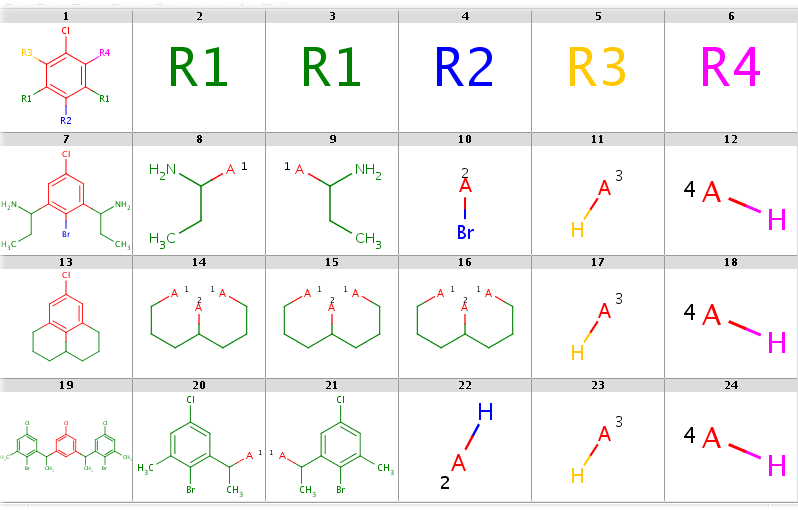 ``` rgdecomp -k -m Rs -q query.mol targets.sdf --bridgingRAllowed:y -a P -f mrv:-a -o resultR.mrv mview --gridbag -c 6 -r 4 resultR.mrv ``` ``` rgdecomp -k -m Rs -q query.mol targets.sdf --bridgingRAllowed:y -f sdf:-a -o resultR.sdf mview --gridbag -t DMAP -p Colors.ini -c 6 -r 4 resultR.sdf ``` <a name="src-1806750-safe-id-ui1ncm91cerly29tcg9zaxrpb25vc2vyj3nhdwlkzs1yzxn1bhrzug"></a> **Decompositions with R-grouped query, any-atom attachment markers**