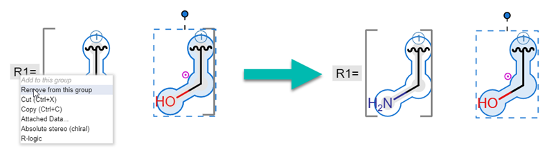 If you want to add one or more fragments to an R-group definition, select these fragments (with the Selection tool), right-click on the relevant R-group label, then choose the Add to this group option.