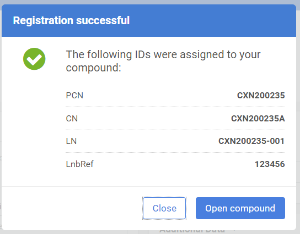 The successful registration is summarized in a window, where the allocated Ids are listed: PCN (Parent Compound Number), CN (Compound Number), LN (Lot Number). Since pyridine structure is being registered for the first time, the new lot will be registered under a new PCN and version, and as a first lot of the tree.