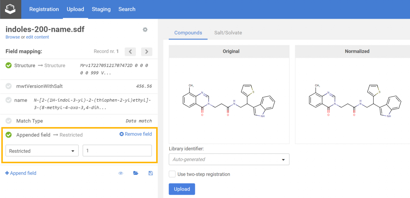 During a bulk upload process a field from the uploaded file can be mapped to the "Restricted" field and as a consequence all those structures will be registered as restricted.