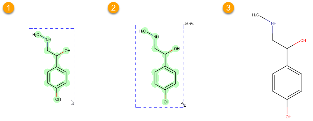 It is possible to scale objects, that is, bonds, reactions arrows, graphical objects, or text boxes can be scaled. Both individual objects and sets of objects can be selected.