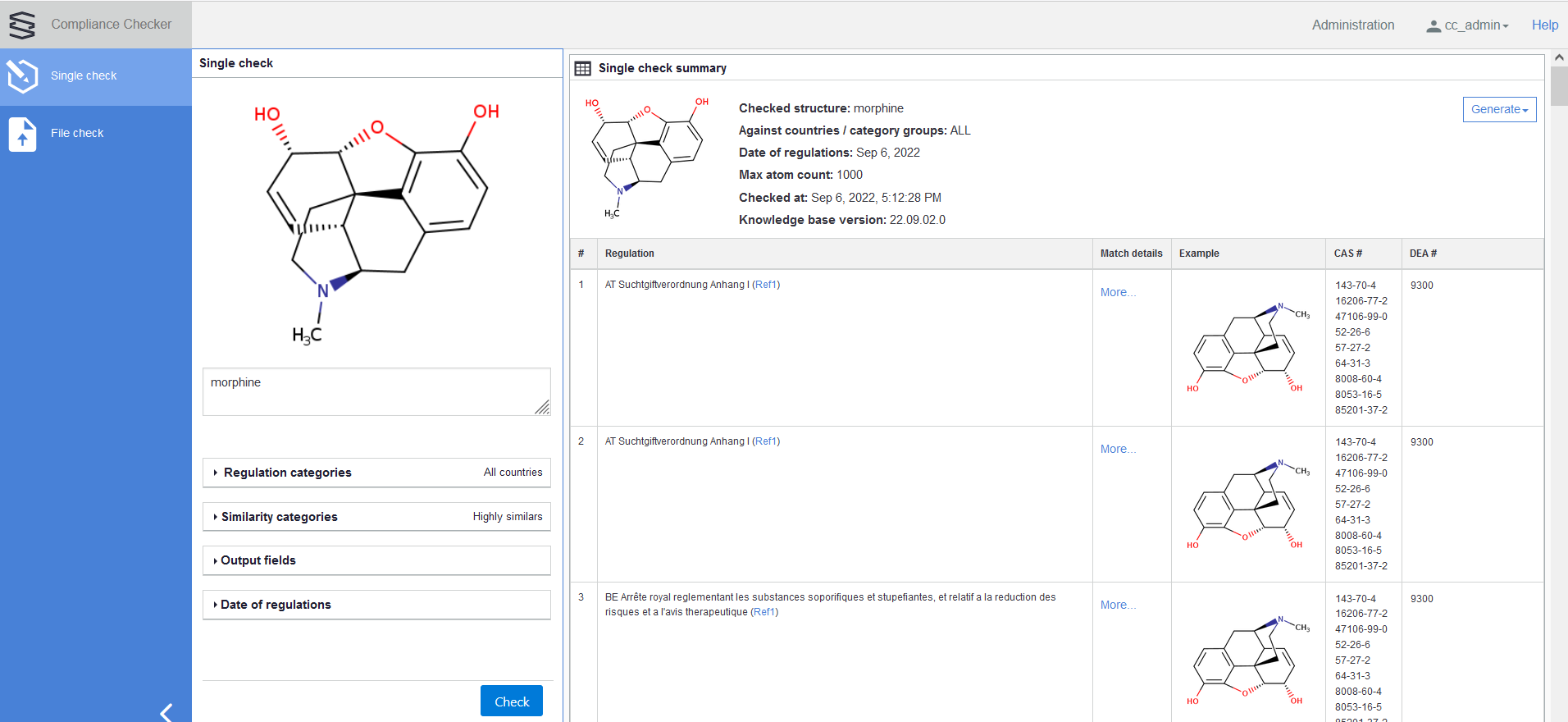 The results of a single search are shown on the right panel of the window. On the top of the table, the image of the checked substance, its name, the categories against which the checking was run, the applied date of regulations and the maximum heavy atoms setting, the date and time, and the Knowledge base version of the check are displayed.