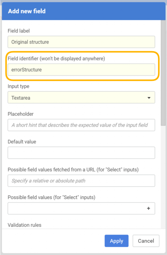 In order to prepare the system for storing the original (invalid) molfile as a text, an additional data field should be created (Administration/Forms and Fields) that has the "errorStructure" as field identifier.