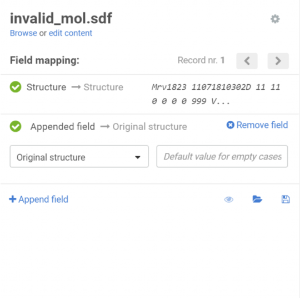After uploading the file, the records that have invalid structures will be converted to "No structures" and will have the structure as text in a field stored as additional data to the compound.