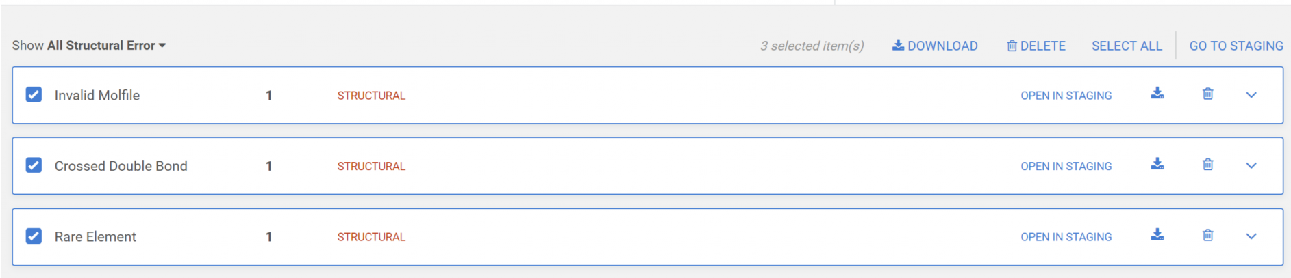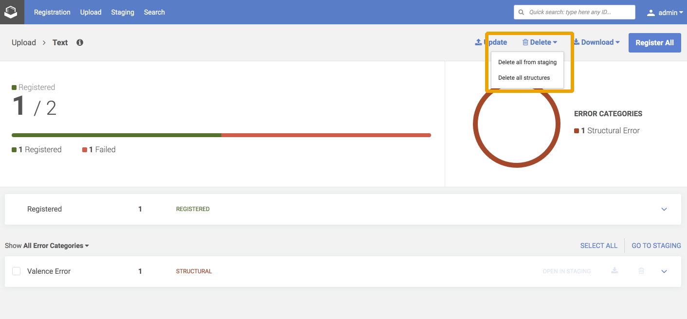-Delete all structures: With the help of this function you can delete all submissions from staging and all registered structures that were created during this bulk upload. Registered structures can be only deleted if they were not modified since the upload.