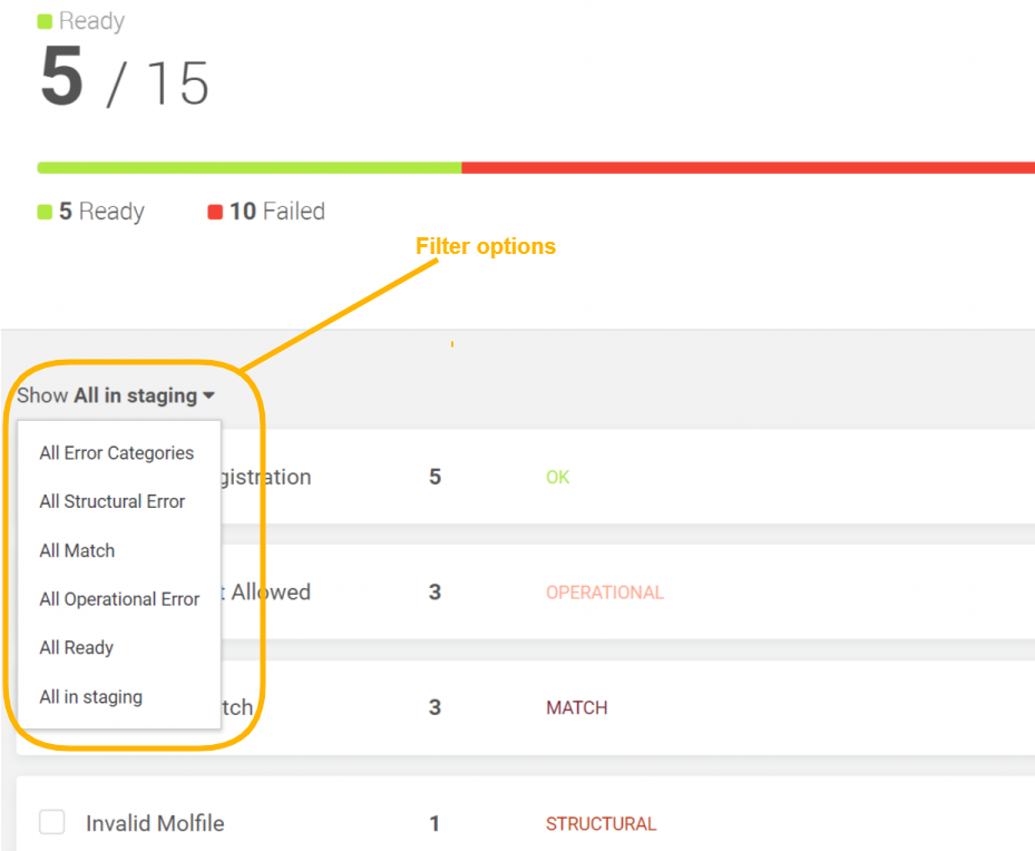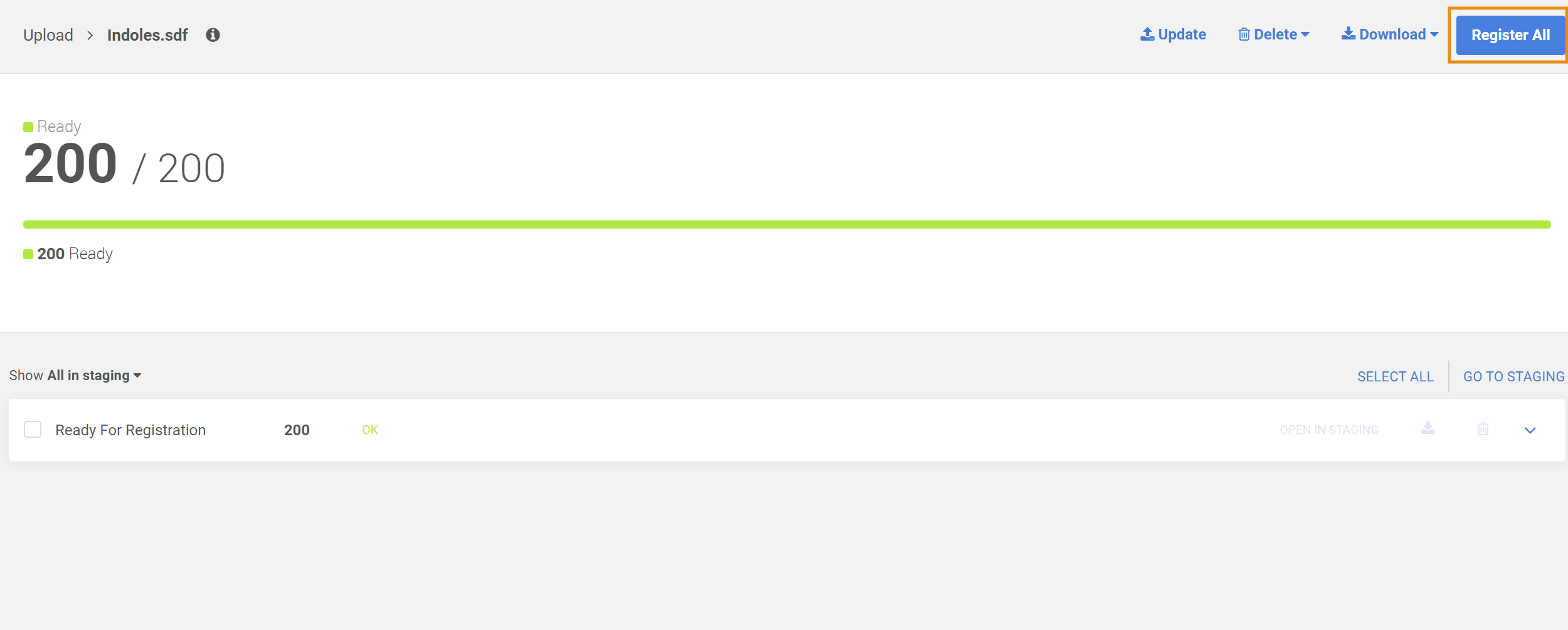 In case when a regular bulk upload process is made the successfully registered compounds appear in the Registered category.