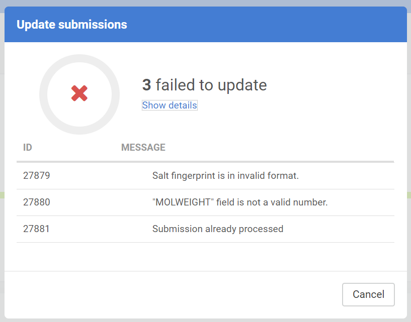 The user can easily download one or all the problematic structures and fixed them locally and then re-upload them with the update option, and register the whole uploaded set without errors. The update process performed based on matching submission IDs, in case of non-matching submission ID, the update attempt will be ignored. When the update is finished the number of successful and ignored structure updates appear.