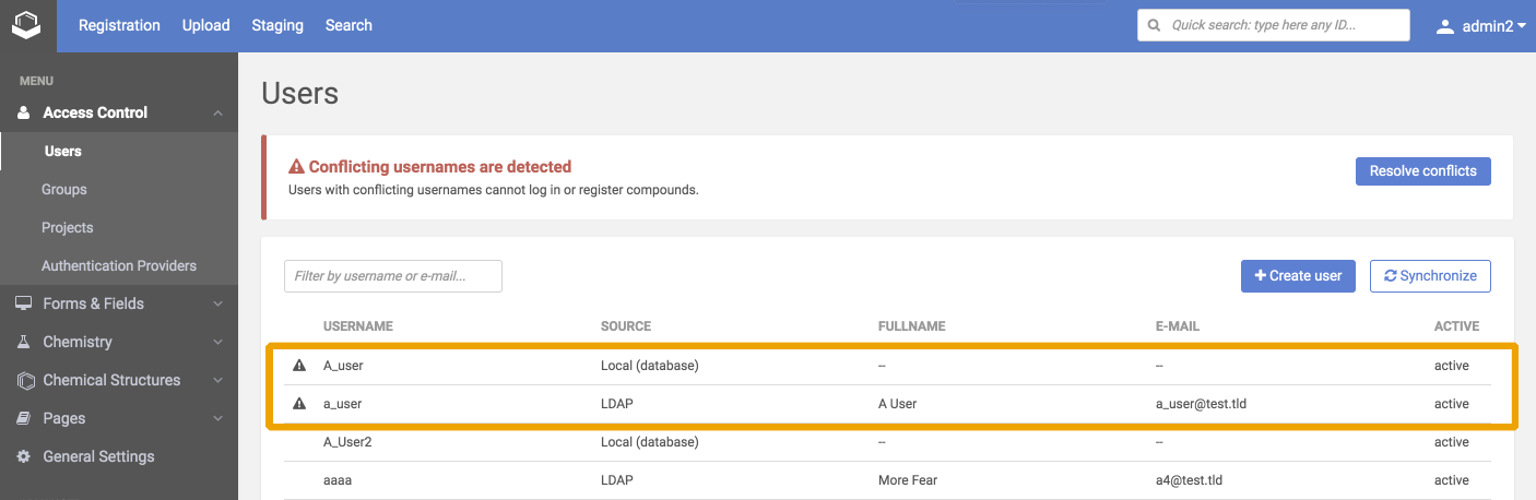 • Merge a conflicting user pair using the resolver page above. During a merge operation, the remote user remains and inherits the local user's activity. Please note, that the system can merge users only if the remote user has no activity yet. Activity means for example if there is a compound assigned to that user or the user made any changes on a compound. When a local and a remote user is merged the 'new' user will get the groups from both users.