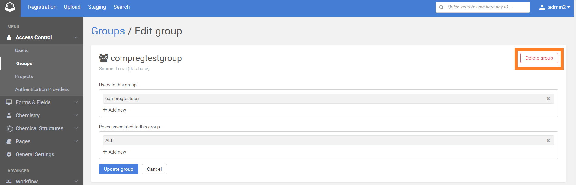 For example, for a user to be able to register a compound, it needs to have the AUTOREGISTER or the ADVANCED_AUTOREGISTER role. Predefined groups associated with this role are the USER and the REGISTRAR groups. For more information on roles visit this page.