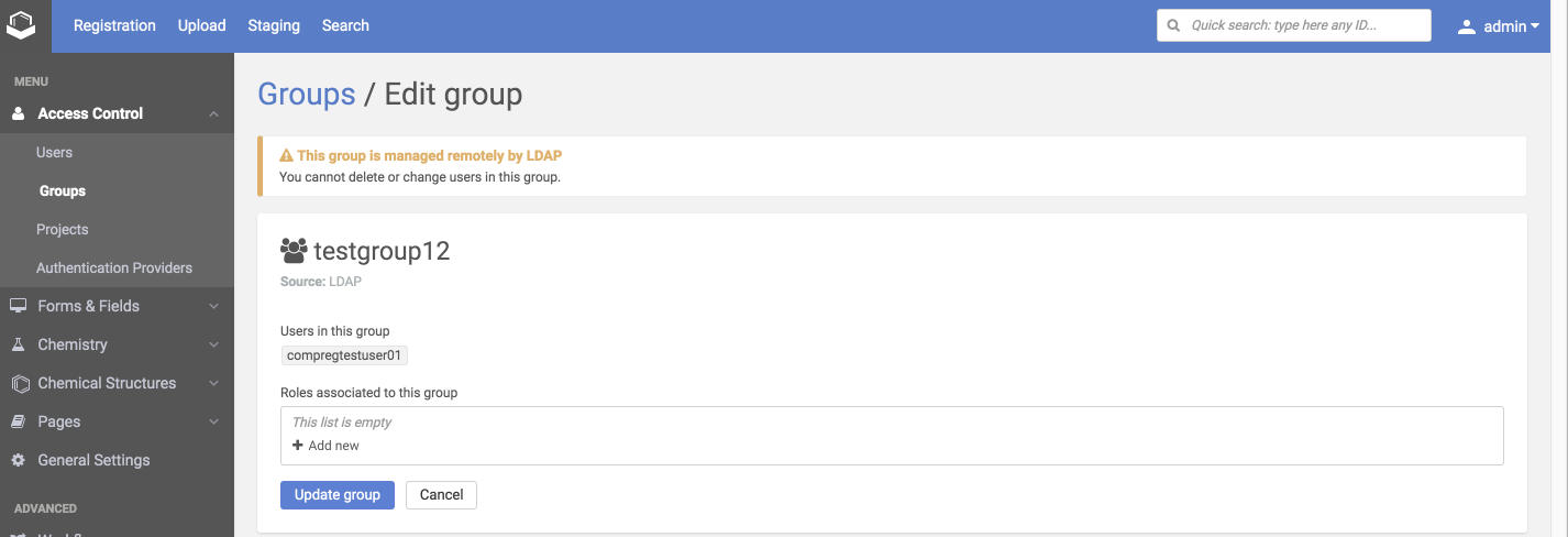 2. Store a group in LDAP/AD with the same name as a group in Compound Registration that has the given role associated with.