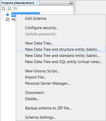 Next we should need to create a data tree with a structures table and there are two approaches to this. You can either right click on the schema node and a menu will appear. Then select New Data tree and structure entoty (table)... . Alternatively, you could complete the same result with operations in the schema editor with the same result. Create a structures entity in the entities tab by right clicking New Structure entity (table)... . Then at the data tree level, promote it using New Data tree from entity ... * Additionally, you can create the entity directly at the data tree level by selecting *New Data Tree and structure entity (table)... Using the preferred method, create a data tree with a root node named "PubChem2Da".