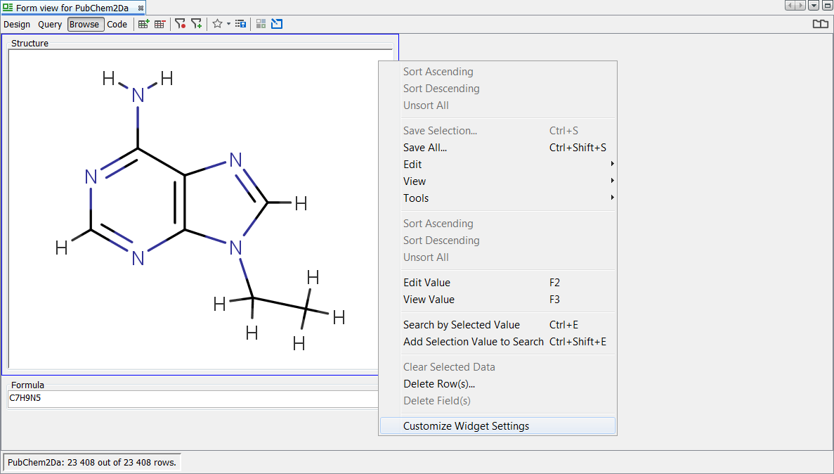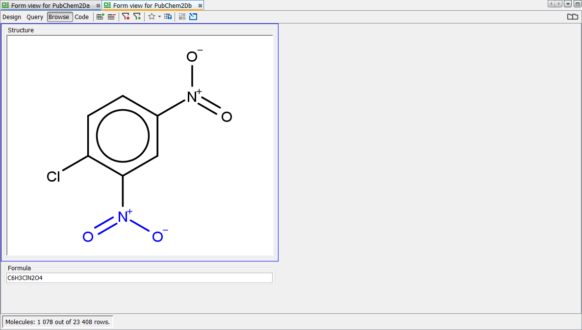 Once import is completed we can execute some queries within the entity to assist in understanding the default rules and how they impact on search and display. Open a grid view or create a new default form view with MolPanel and view all records. The first thing the astute user will notice is that the molecule's visible in the display appear to have not been standardized according to the default rules. In fact, the internal table stores both the original and standardized versions of the structures and there is a visual properties, display setting property for the widget.