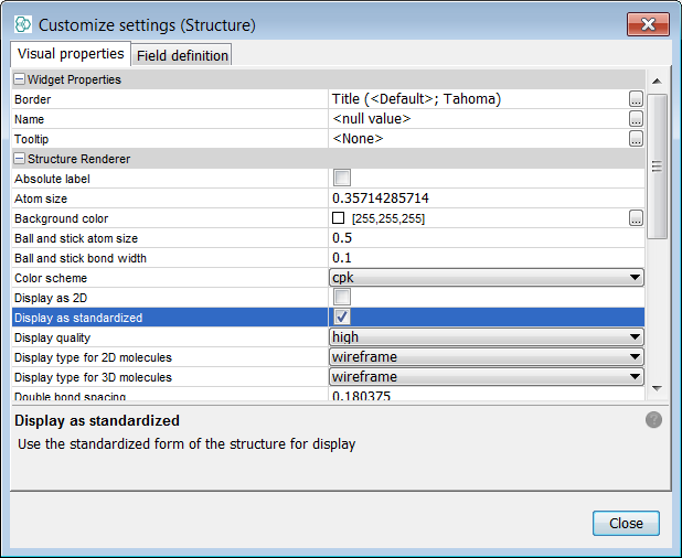 Right click on the MolPanel widget and select Customise Widget Settings . In the visual properties tab, tick the "Display as Standardized" tick box. You will now see the display looks like the expected default standardization rules. The same change needs to be applied separately to the grid view using the structure column. Below we can see an example record before and after standardization.