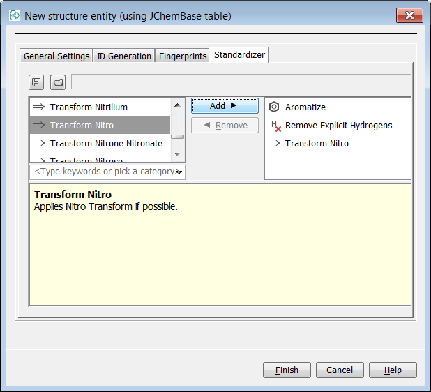 Next, we will create a new entity in order to show the application of standardizer rules at this stage. create a data tree with a root node named "PubChem2Db". In the Standardizer tab, create an associated Standardizer by pressing Create Standardizer . Add the "Nitro" action. Select Finish and the entity is created. Import the same SDF file once more and create a form view with a MolPanel.