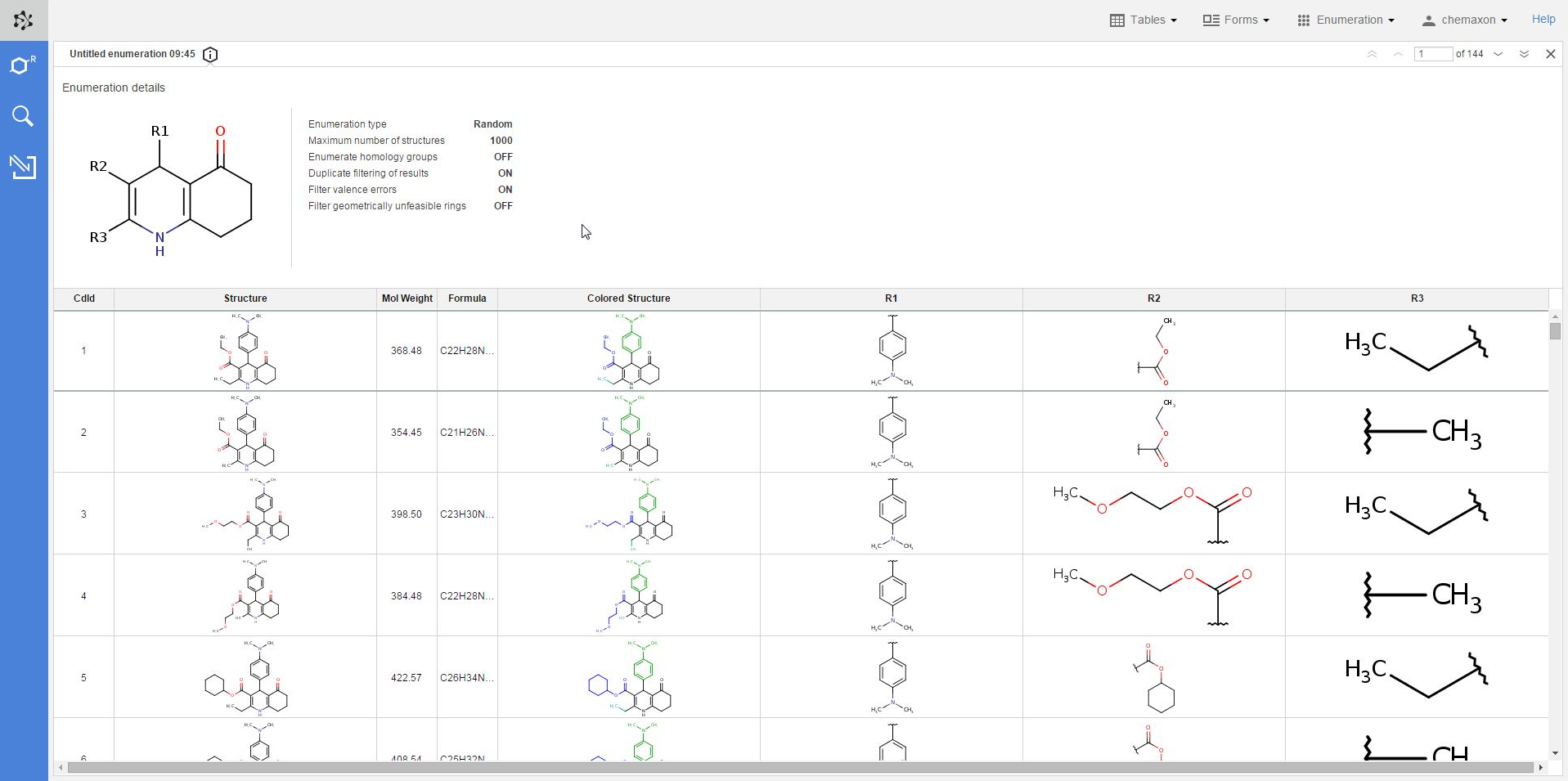 The new table will contain the following columns: the compound identifier (CdId) of the enumerated molecules, the structure, mol weight and formula of the enumerated structure, the respective substituent group for each R-atom, and the "colored structure", which corresponds to the coloring of the enumeration preview: the scaffold has black color while each R-atom substituent appears with a different color.