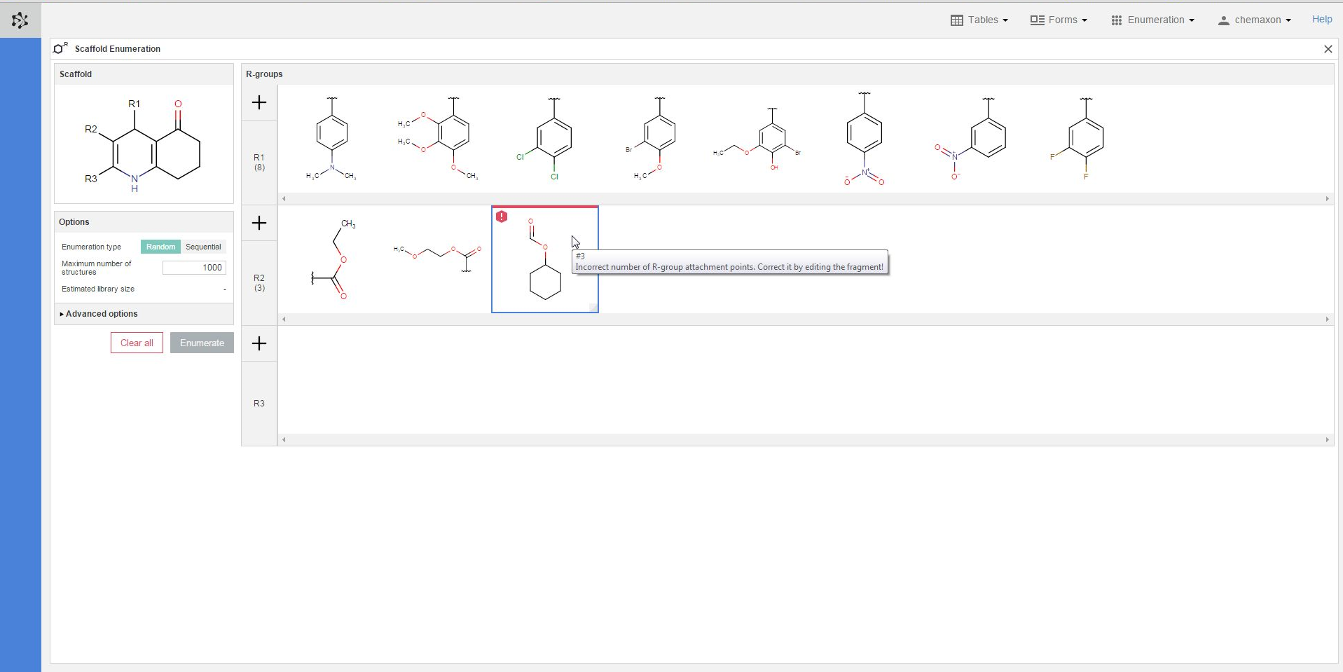 - Random enumeration: during the compound library generation, the scaffold R-atoms are replaced by randomly selecting from the available substituent combinations.