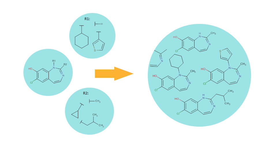 Enumerating the full library corresponds to **systematically generating of all possible combinations ** of the R-groups on the given scaffold. As a result, we will have a virtual library that contains structures derived from the same scaffold but having different substituents.