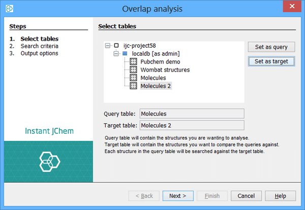 - Create a JChem entity (database table) for each of the sets of structures you wish to analyse. These do not have to be in the same database, but typically are. Here we will assume that you have created two JChem tables, one with the query structures and one with the target structures.