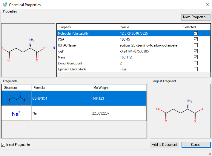 Only some default properties ( IUPACName , logP , Mass , DonorAtomCount , PSA , LipinskiRuleof54of4 ) are available by default. Property name and value calculated for the current structure are displayed in the first two columns. Use the third column to add the current property to the document, presentation, or email message. Selected properties are available at the top of the list and JChem for Office remembers your last selection.