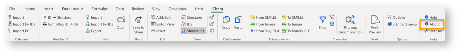 In JChem for Excel, it is possible to check the DirectX information through the About JChem for Excel dialog. This way, users can get detailed information about the used DirectX versions and the DirectX processes (dll names, versions, and so on) that are used by Excel.