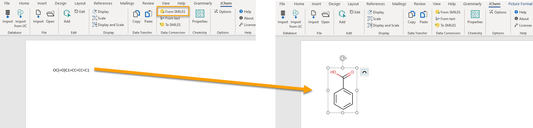 2. Select a SMILES string and convert it to structure by clicking the From SMILES button on the JChem ribbon.