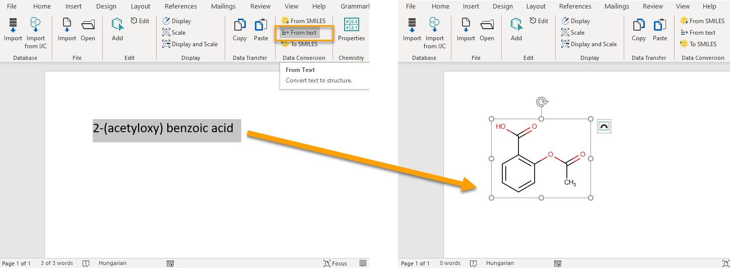 Select a text and convert it to structure by pressing the From Text button on the JChem ribbon.