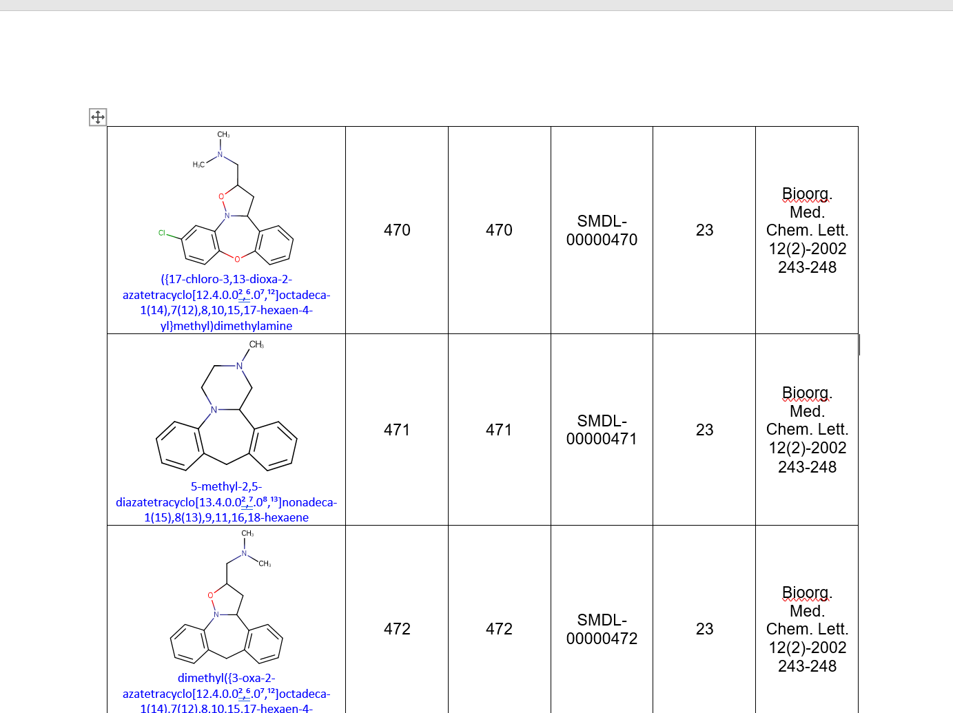 The structures and corresponding data are pasted in a table to the opened document (in this case Word), IDs (IUPAC names in this case) are displayed in the same cells under the structure.
