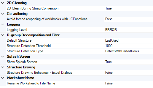 The figure below shows the general options of JChem for Excel.