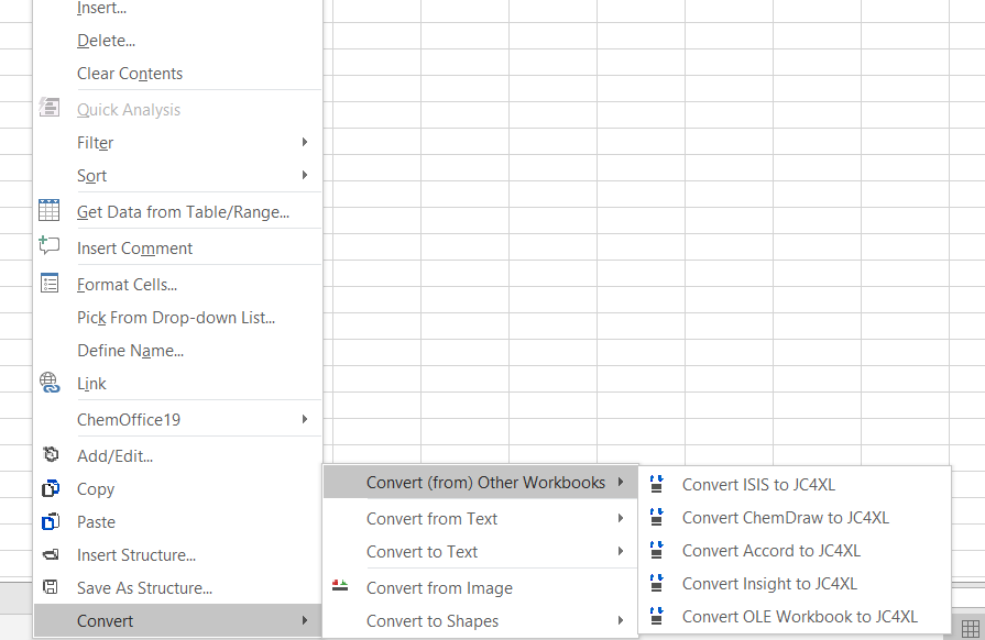It is possible to convert the following file formats to JChem for Excel files through the context menu:
