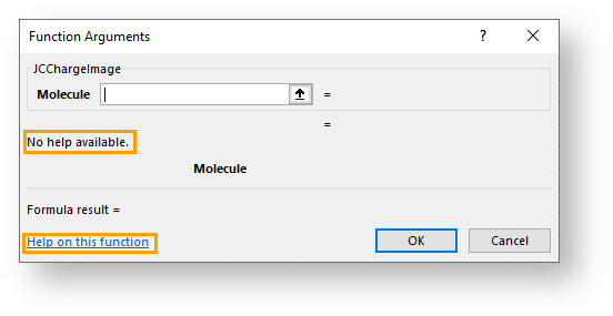 Since version 6.0 of JChem for Excel, the Help on this function button is available for JChem for Excel functions in the Function Arguments dialog.