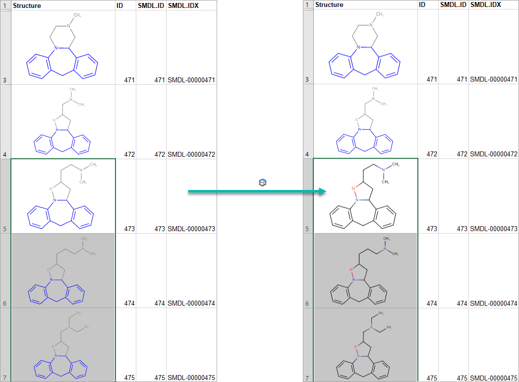 After the filtering process is completed, only those structures remain on the worksheet that fulfill the specified criteria. The matching substructures are colored with the specified color. Non-matching rows are hidden from the worksheet.