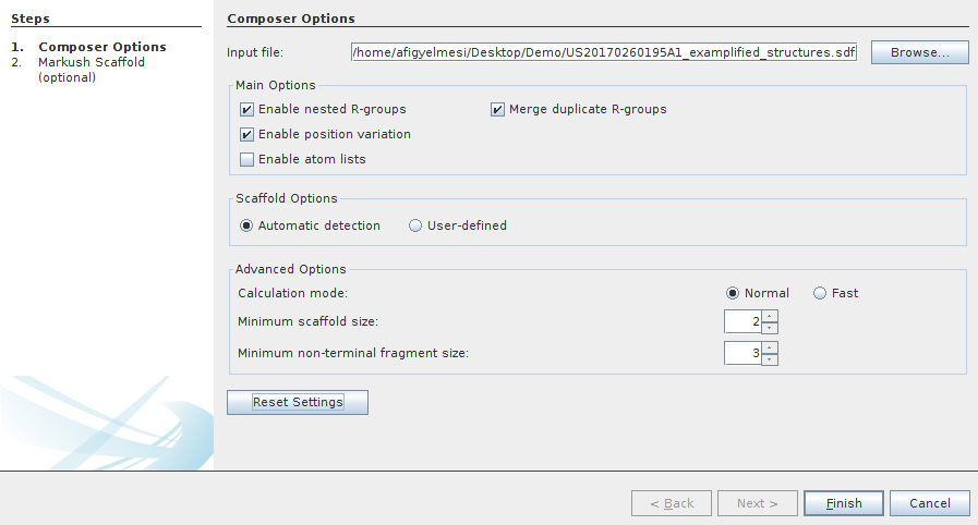 With Markush Composer wizard, you can automatically generate Markush structures from a set of compounds. The compound set has to be in a single file (SDF, SMILES, etc). The composer wizard can be opened from File->Compose Markush Structure...