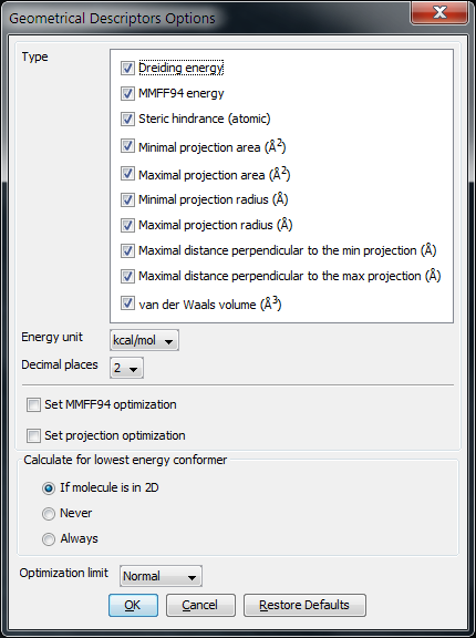 The following options can be set in the Geometrical Descriptors Options window: